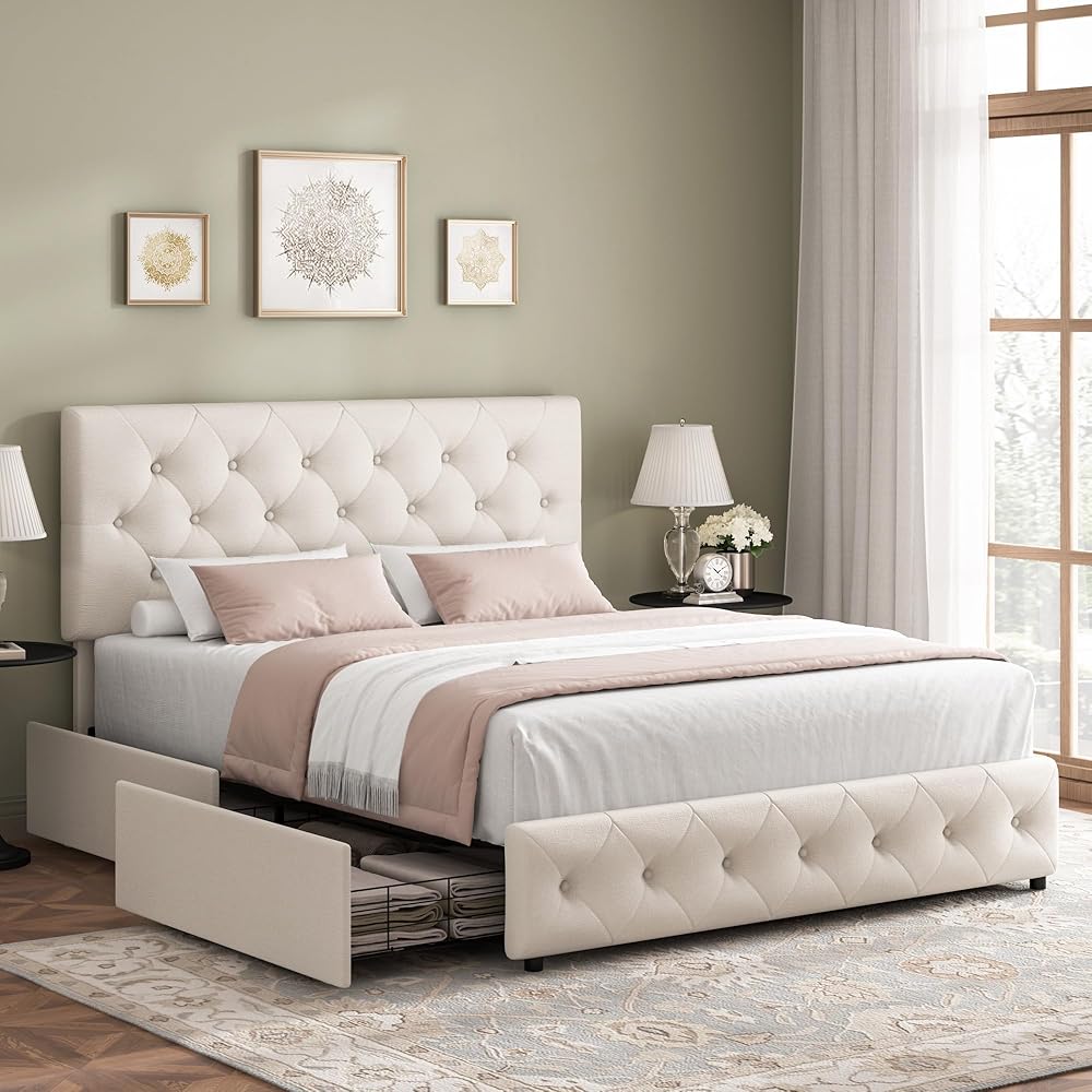 This premium upholstered bed features a soft padded headboard and spacious storage drawers, making it ideal for modern bedrooms.